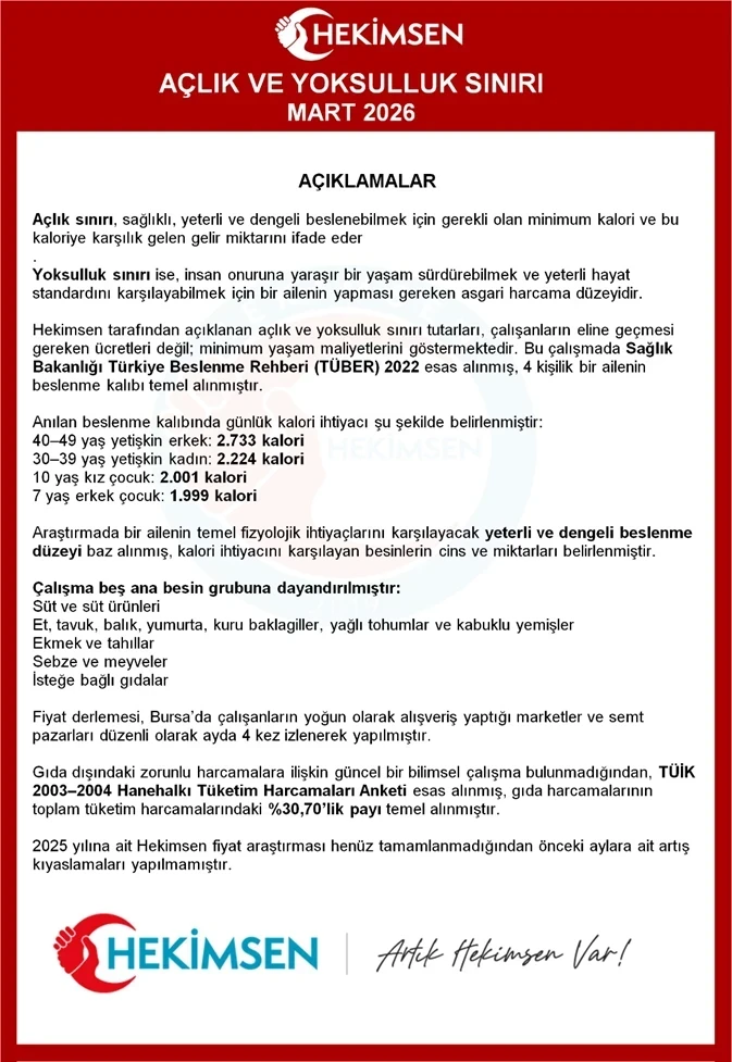 Hekimsen olarak; ücret politikalarının, vergi sisteminin ve sosyal destek mekanizmalarının açlık ve yoksulluk sınırı verileri dikkate alınarak yeniden düzenlenmesi gerektiğini bir kez daha vurguluyoruz.